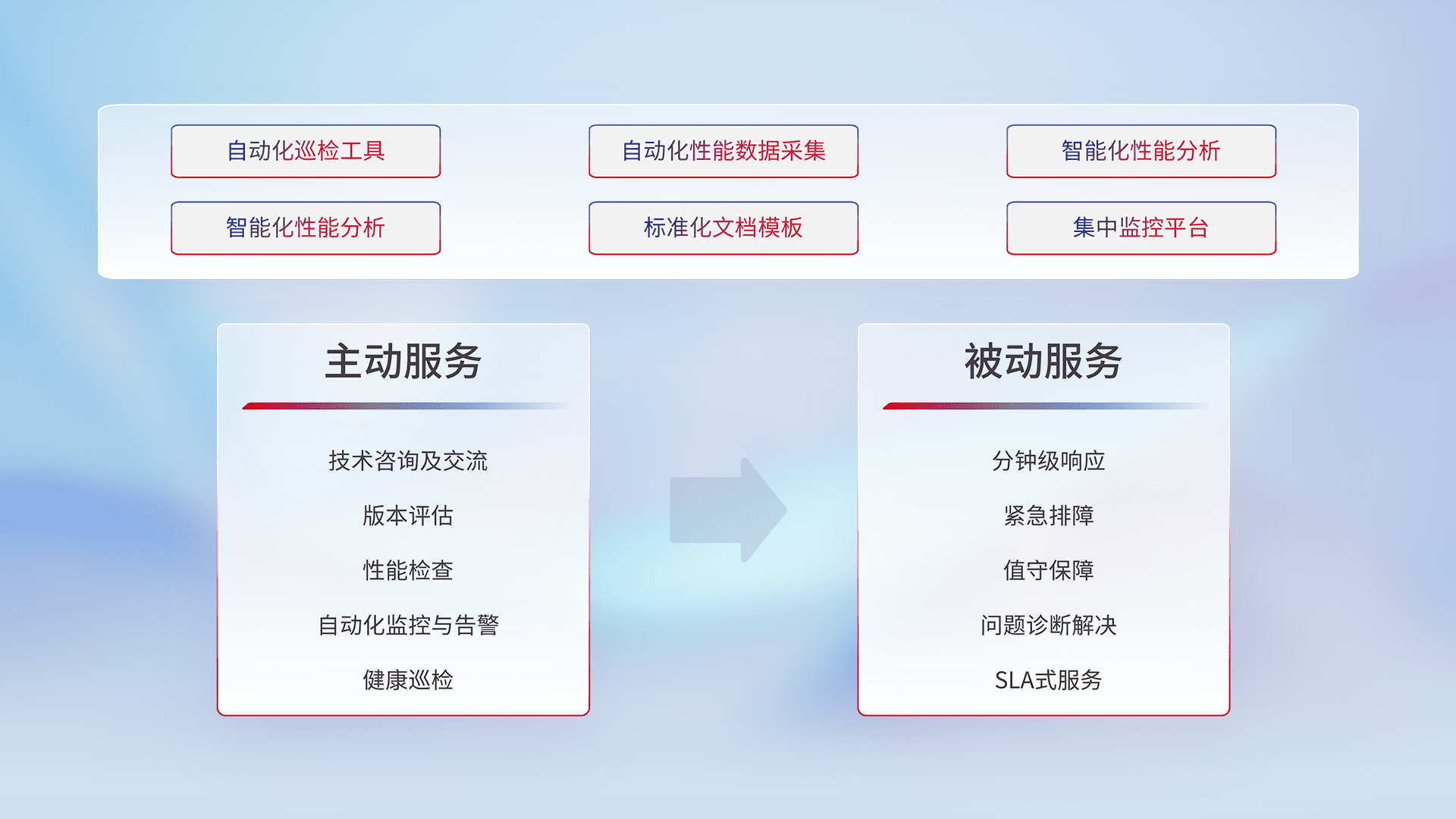 智能化工具和标准化文档,,,,保障服务质量,,,提供主动服务(包含技术咨询、、版本评估、、、、性能检查、、自动化监控与告警、、、、健康巡检)和被动服务包含(分钟级响应、、紧急排障、、值守保障、、、、问题诊断解决、、、、SLA服务)。。。。